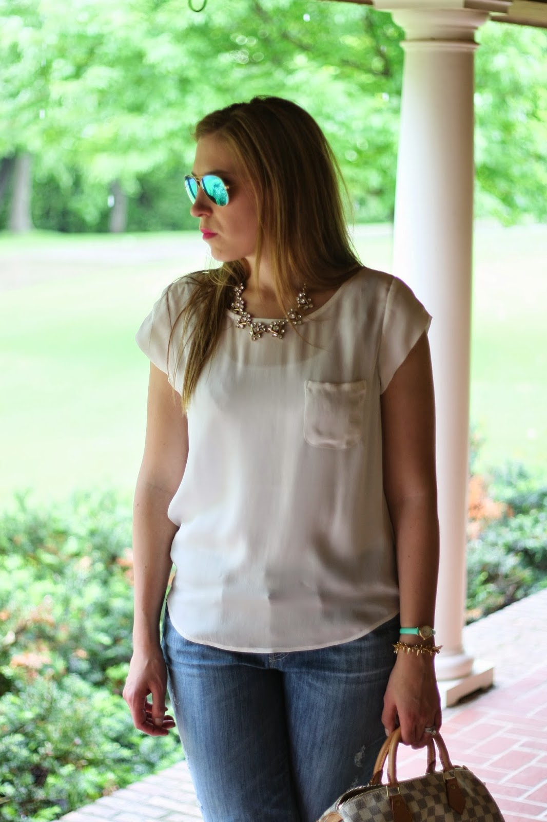 Tee: Joie (on sale), Jeans: Vince, Shoes: French Connection (on sale) c/o, Watch: Kate Spade c/o, Purse: Louis Vuitton (similar), Necklace: J.Crew (similar), Bracelet: Stella & Dot, Sunglasses: Ray-Ban, Lipstick: Mac