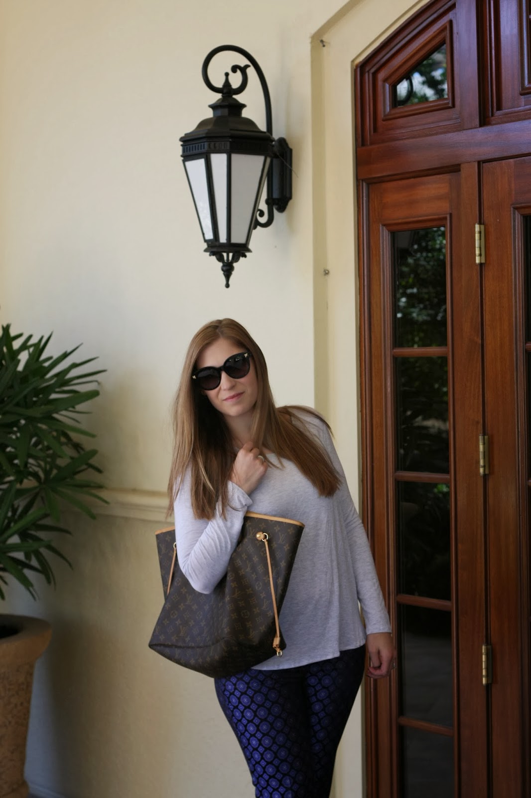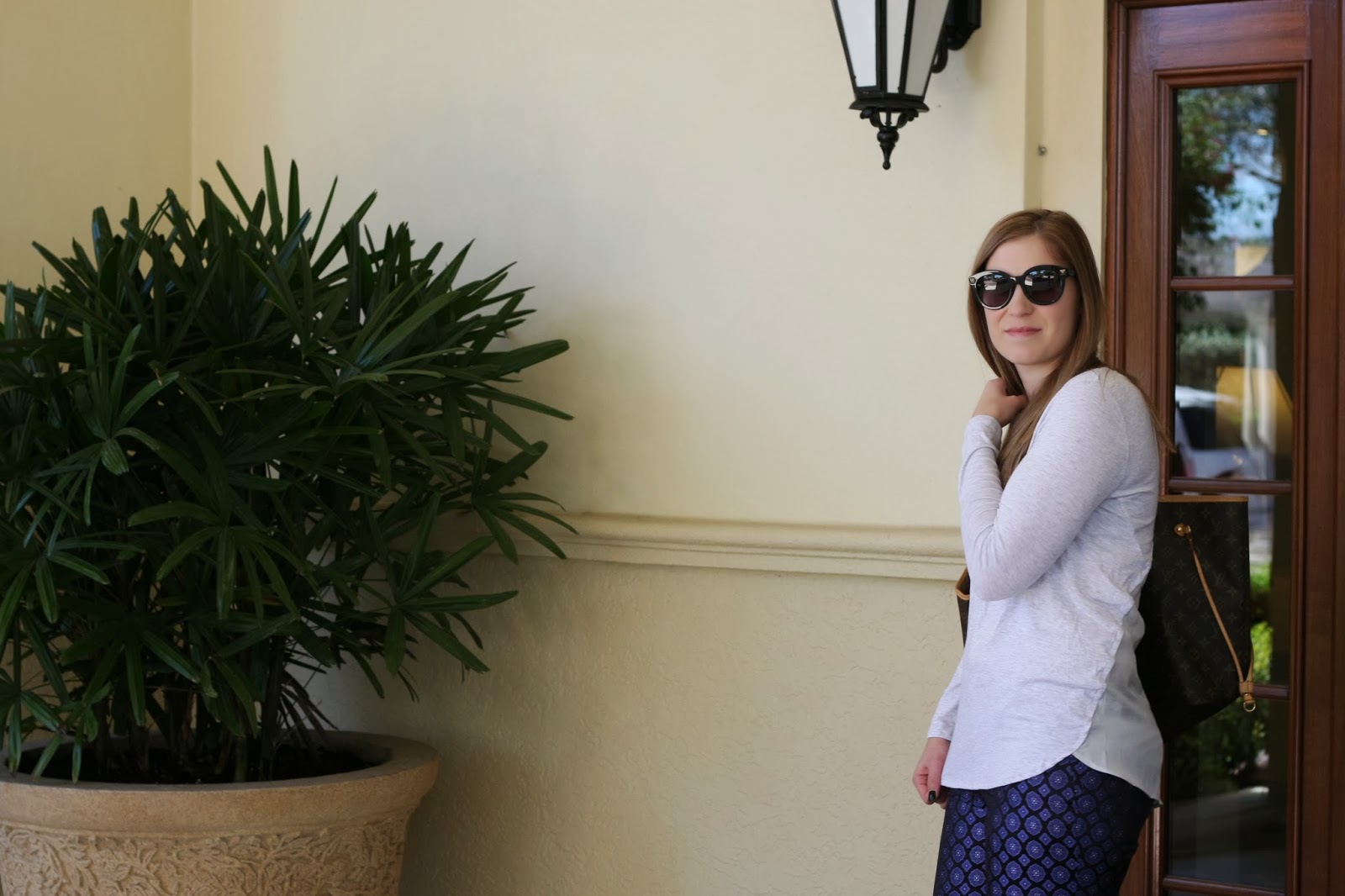 I love this top because it looks like a basic tee in the front but then the back has a sheer panel in it. Cutouts, open back, and sheer panel tops are big for the spring. I love this color gray too because it makes me look tan, which is not easy to do. I LOVE the pants I’m wearing in these pictures. The pattern is one of my favorites. It’s so nice that it’s light out later now, but I need that hour back that we lost yesterday!