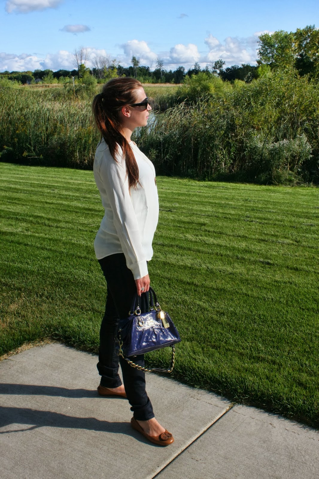 Shirt: J.Crew, Pants: J Brand , Shoes: Tory Burch, Necklace: Madewell, Sunglasses: Ray-Ban, Bag: Tory Burch (similar),