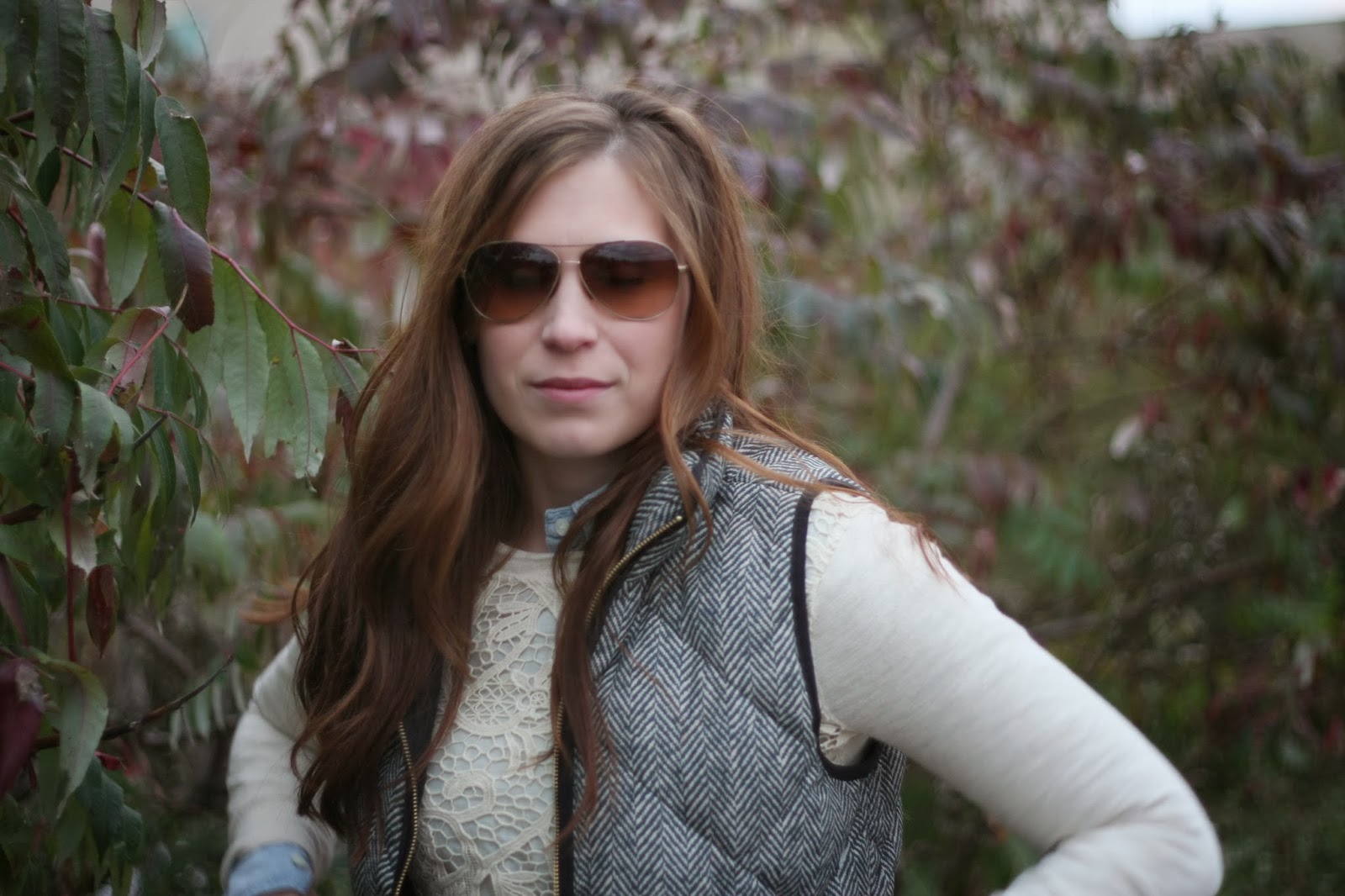 Sweatshirt: J.crew (similar) Vest: J.Crew Factory, (similar), Shirt: J.Crew, Pants: J Brand, Boots: Tory Burch, Watch: Michael Kors, Sunnies: Tom Ford