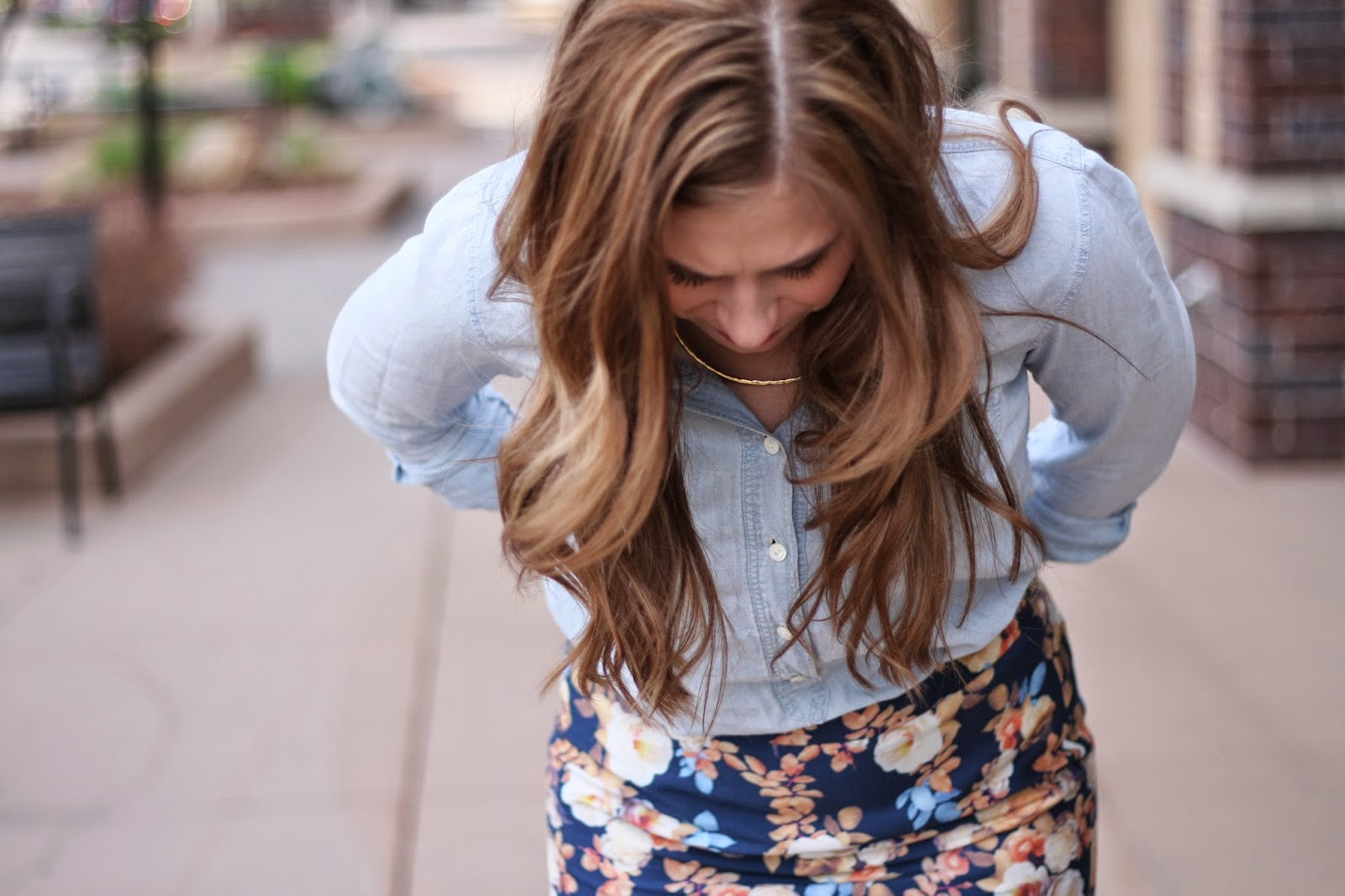 I love this skirt. I wore it the other week to a Derby Party. The pattern is one of my favorites. I got so many compliments on it. I like the skirt with a chambray top because it makes the look more casual. I also like the mixing of textures with the denim on top and silk on the bottom. Click here for some other great pencil skirts. I’m so excited that the weather is getting nicer here. My cousin and I are going to go on a walk this afternoon. I’m so excited to get Miss Dahlia outside and enjoy the weather.