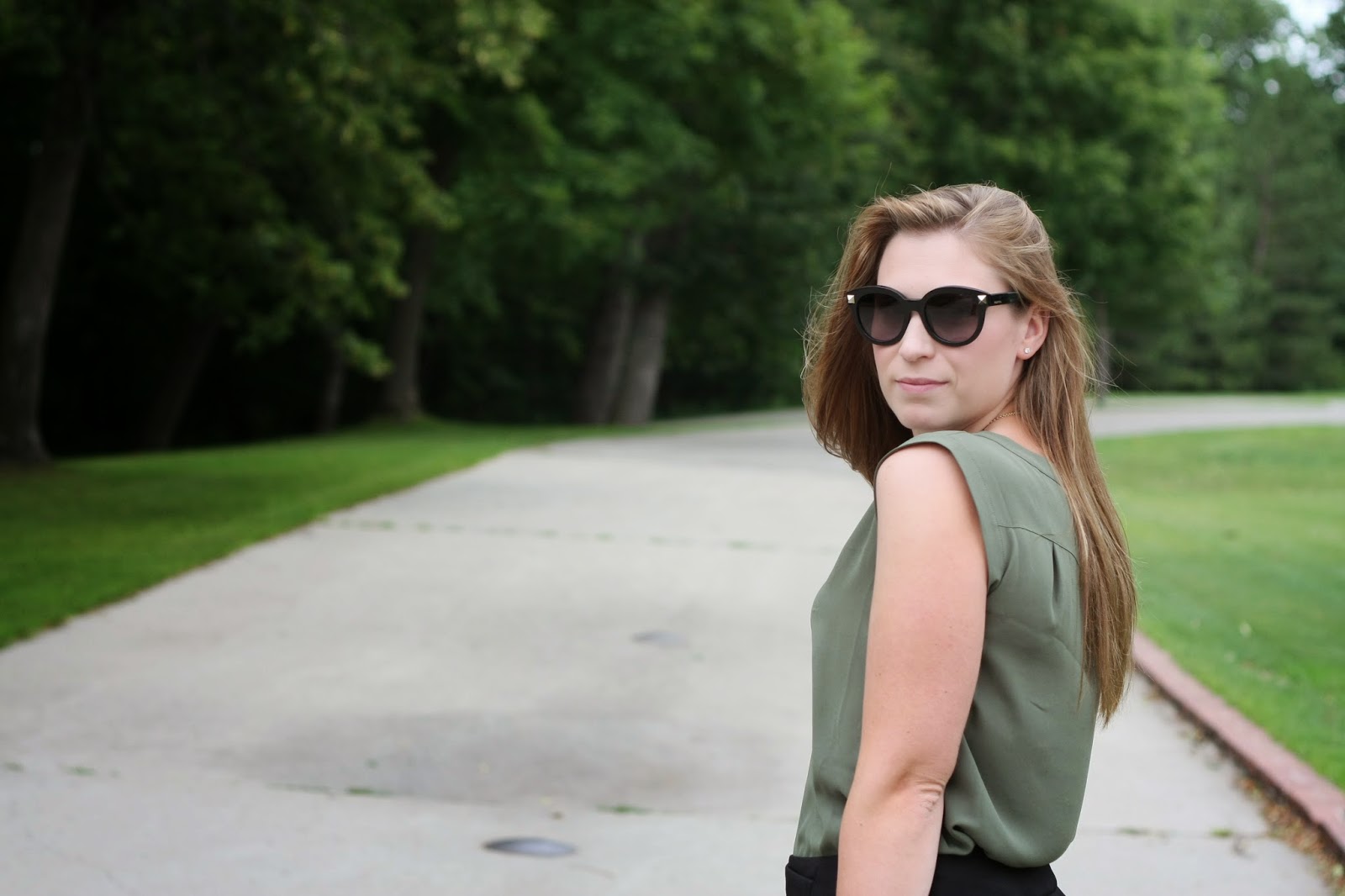 Shirt: J.Crew on sale, Skirt: French Connection (similar), Necklace: J.Crew, Sunglasses: Valentino, Shoes: J.Crew (LOVE these) Purse: Kate Spade