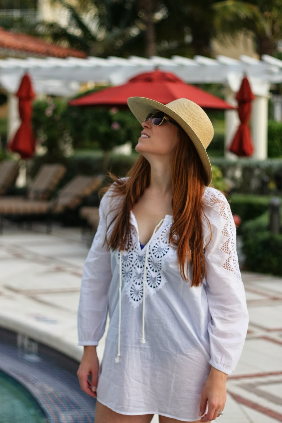 Coverup: J.Crew (similar), Swimsuit: J.Crew, Hat: J.Crew, Flip-Flops: Tory Burch, Sunnies: Tory Burch