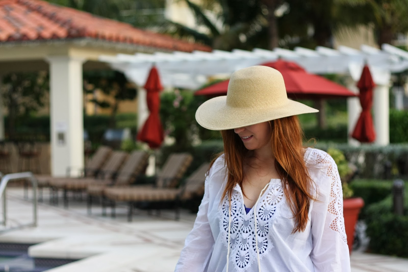 Coverup: J.Crew (similar), Swimsuit: J.Crew, Hat: J.Crew, Flip-Flops: Tory Burch, Sunnies: Tory Burch