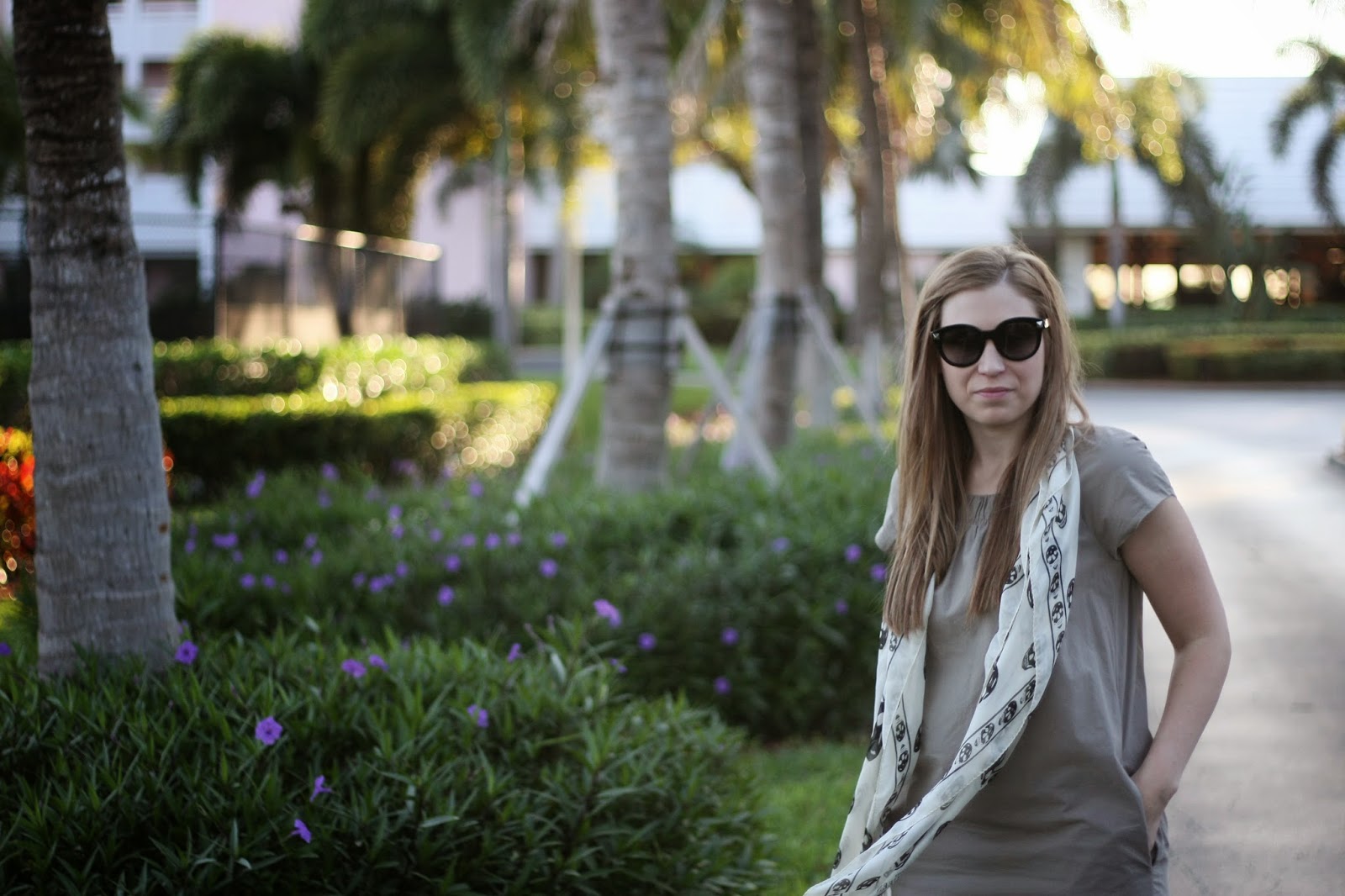 Dress: Vince (similar, love this), Scarf: Alexander McQueen, Sunglasses: Valentino, Shoes: J.Crew, Bracelet: Stella & Dot