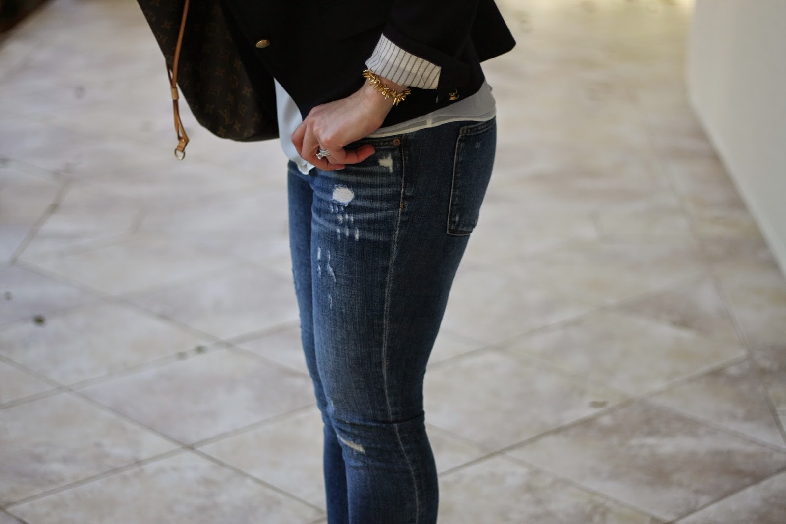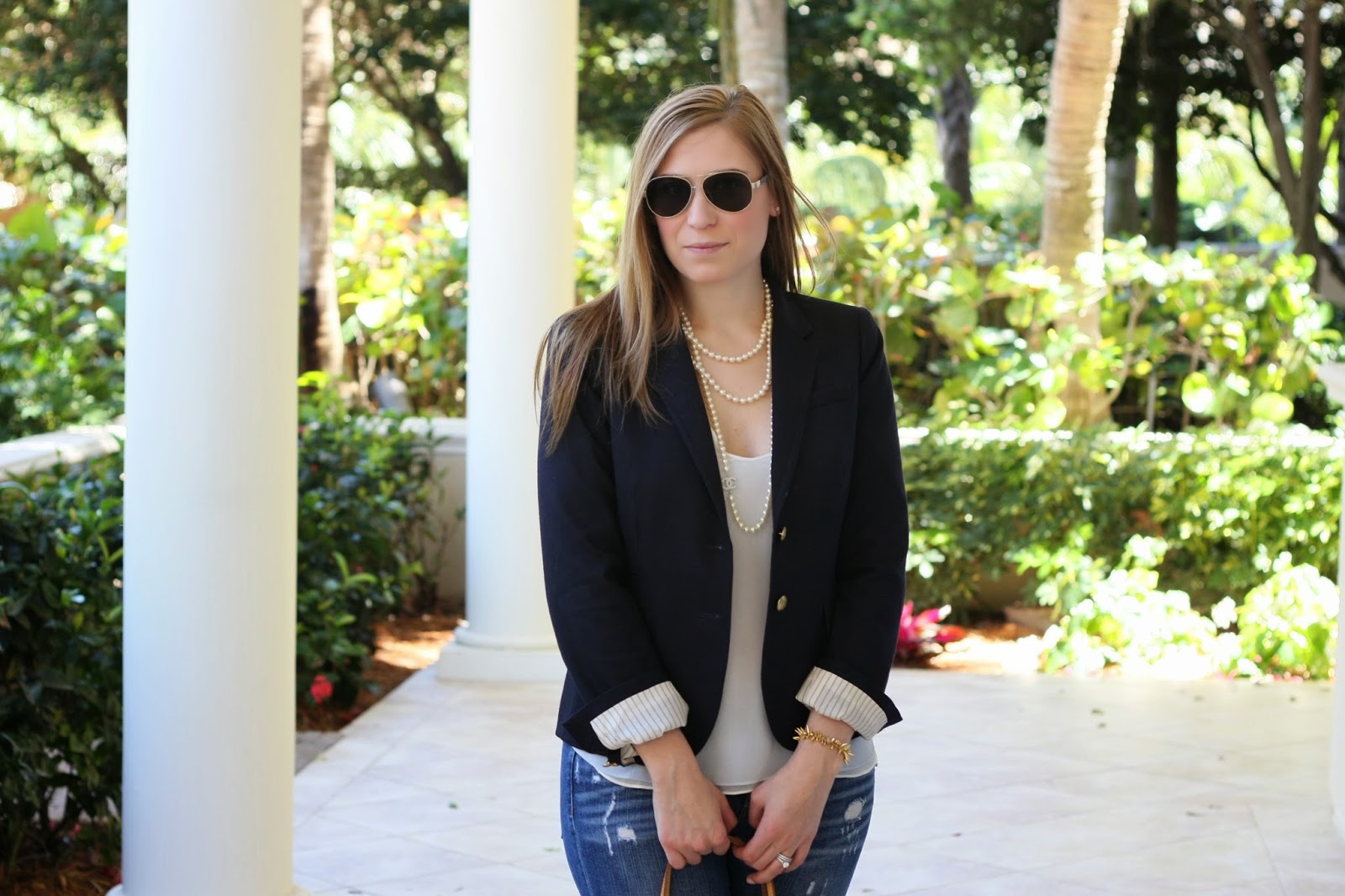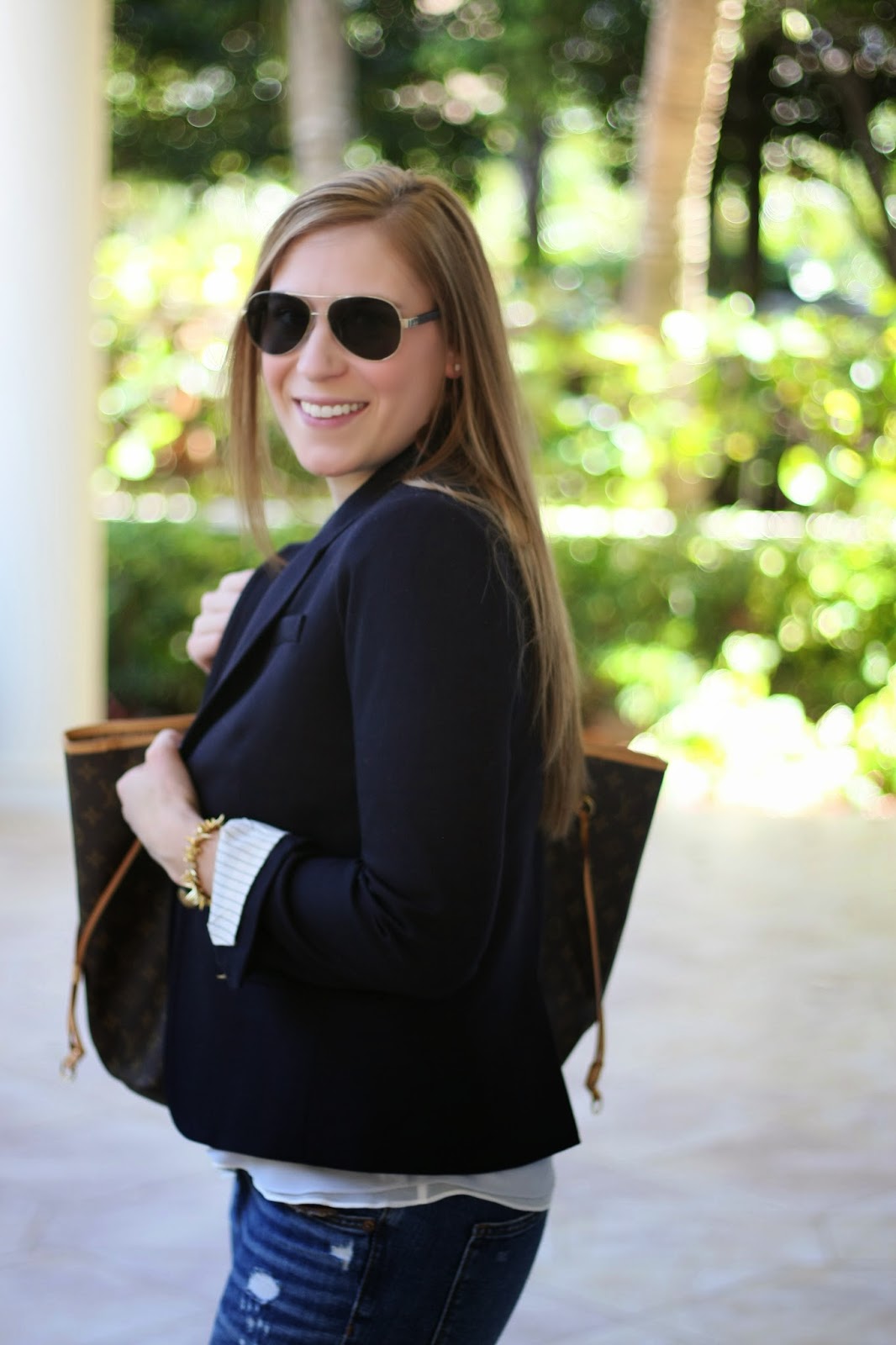 Blazer: J.Crew, Tank: Chelsea28, Jeans: J.Crew, Necklace: Chanel (similar) , Bracelet: Stella & Dot, Shoes: J.Crew, Sunnies: Chanel (similar), Bag: Louis Vuitton (similar)