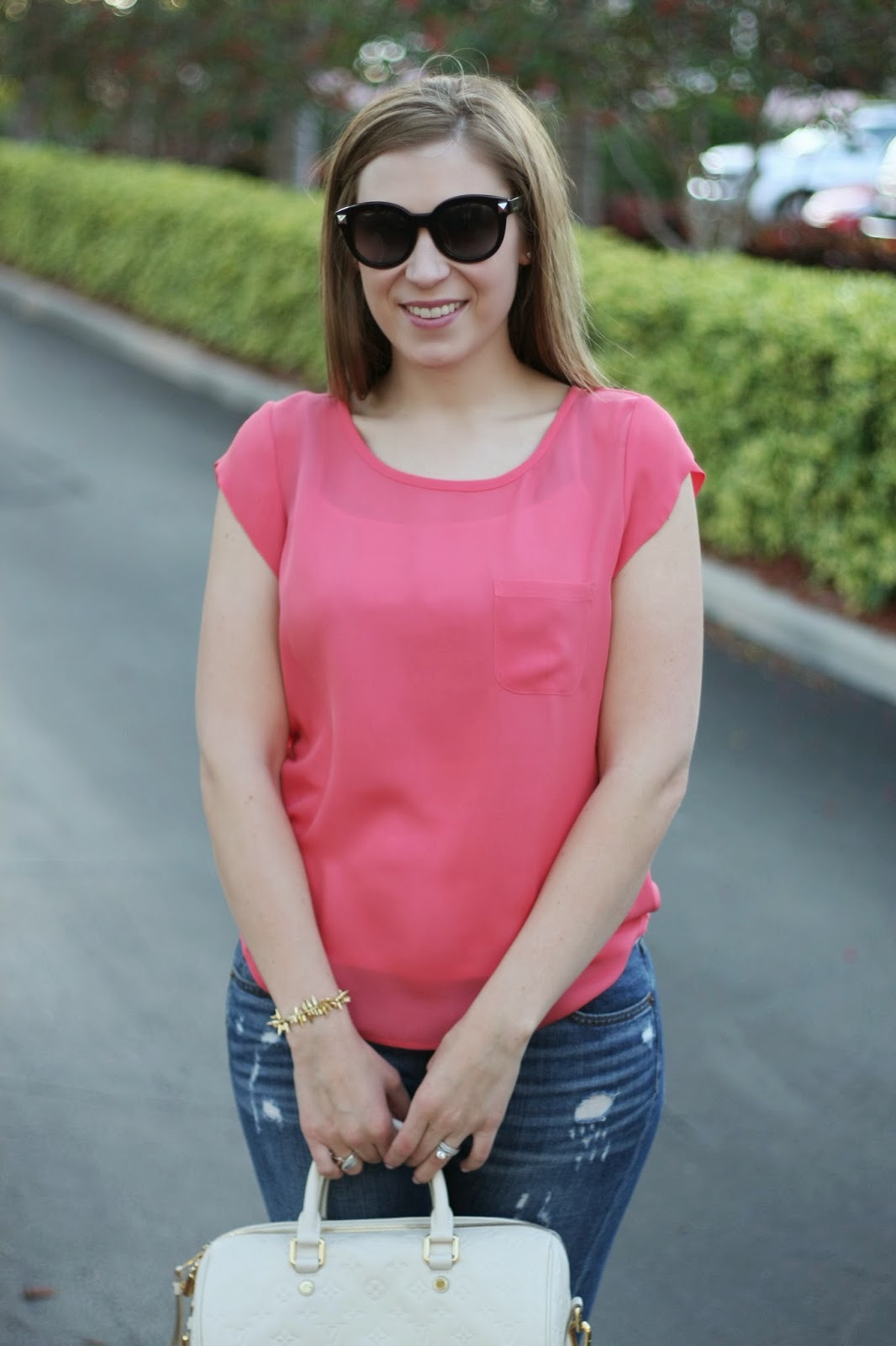 Tee: Equipment, Jeans: J.Crew, Shoes: Tory Burch, Sunnies: Valentino, Bracelet: Stella & Dot, Purse: Louis Vuitton (similar)