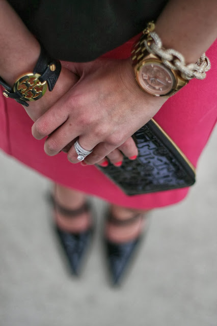 Top: Madewell, Skirt: Halogen, Shoes: Vince Camuto (similar), Sunglasses: Tory Burch Clutch: Tory Burch (similar) Necklace: J.Crew,  Bracelet: J.Crew, Watch: Michael Kors