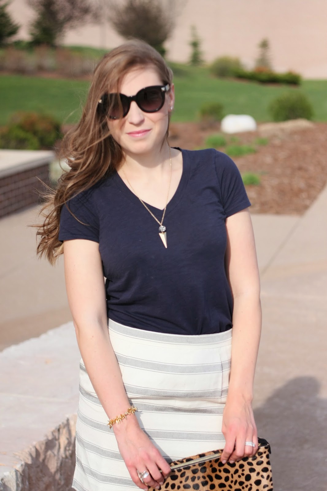 Normally I have one thing that inspires me when I put together an outfit. Today, it was this skirt. I am always drawn to stripes, as you may have picked up on. I like that this skirt can be worn with just a tee. Click here for some cute clutch ideas for summer. A cute dress like this one, and a great clutch are summer essentials for me. What are your summer essentials? Leave them in the comments below or on my Facebook page.