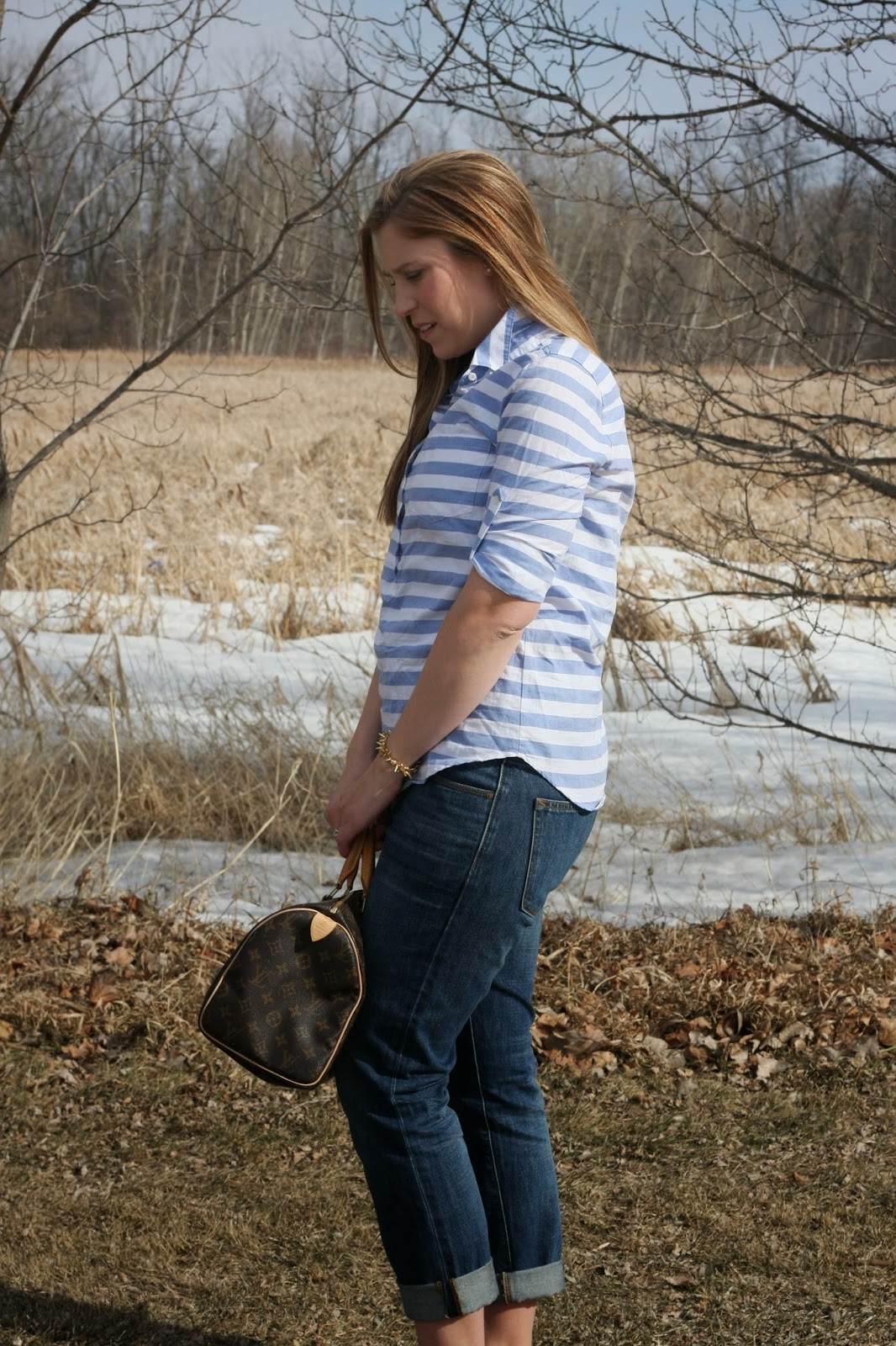 Shirt: J.Crew (Similar), Jeans: Gap, Bracelet: Stella & Dot, Shoes: New Balance, Purse: LV (love this)