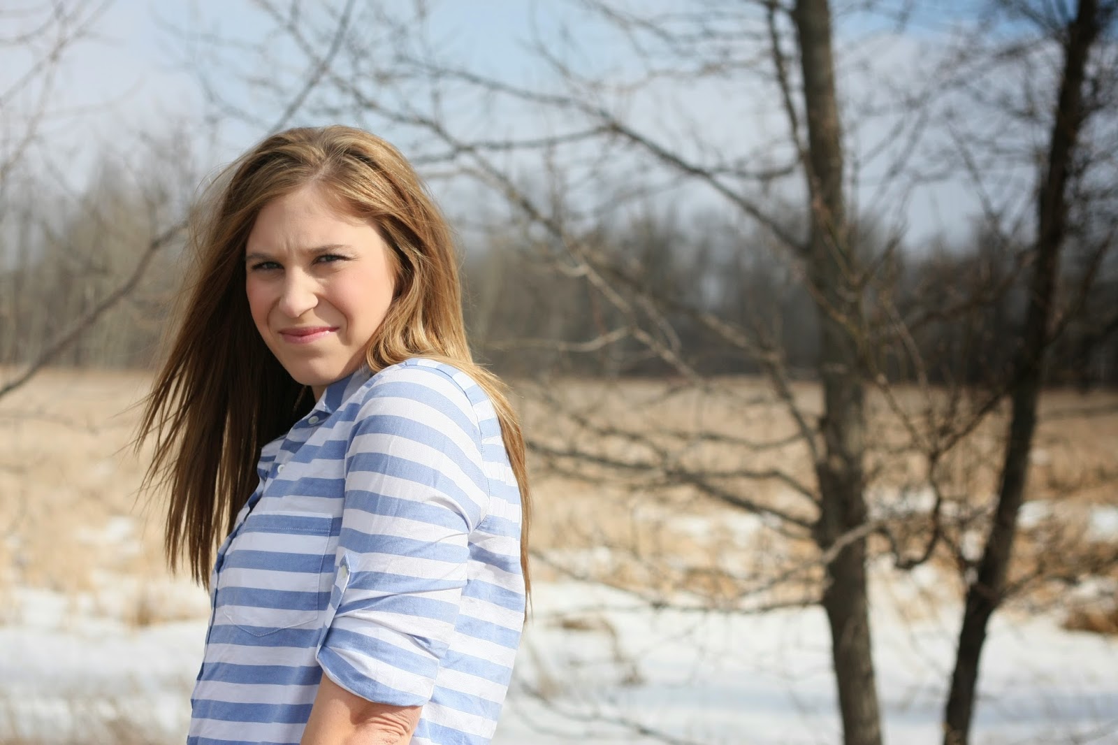 I love this top because I think the light blue and white stripes are so cheerful. Soon enough the snow will melt and spring will be in full swing. I can’t wait for our tulips to bloom in the front of our house. I may try this year to plant some peonies as well. I am not the gardening type, but still want to give it a try.