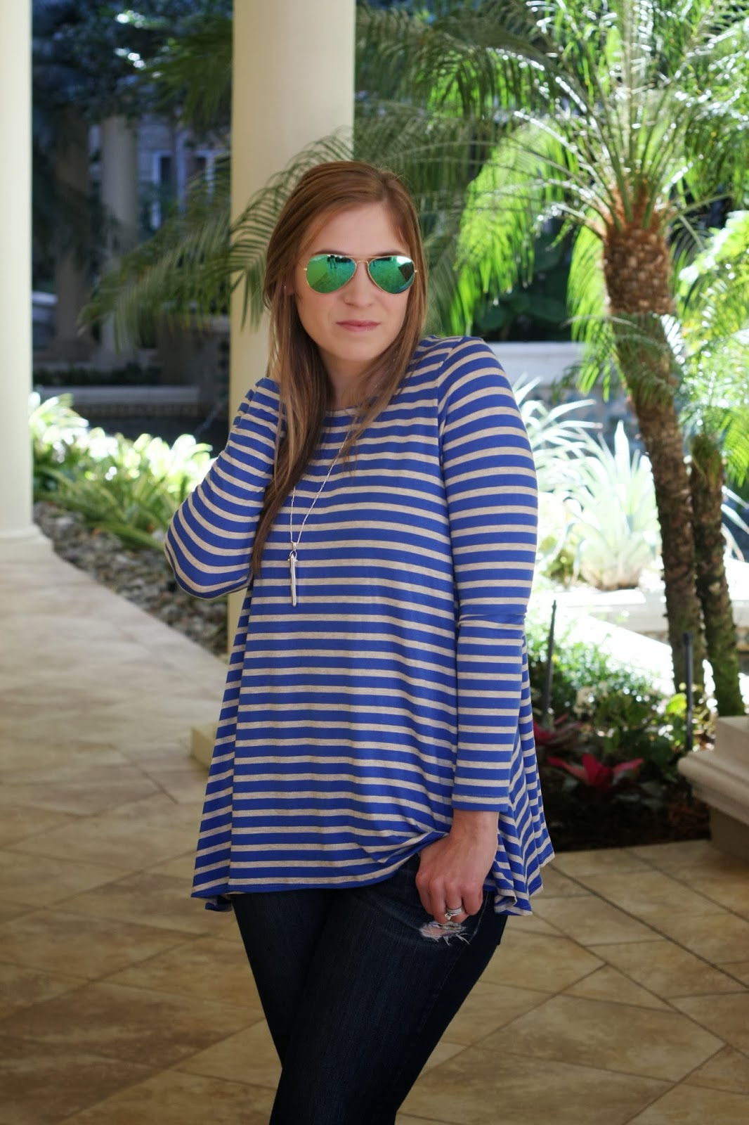 Where did that weekend go! We enjoyed a nice weekend as a family. My husband was able to take a day off of work so we jetted off to some warmer weather. I must say it was nice to get out of the negative temps that we’re getting in Minneapolis. This blue top is so great for a transitional look from winter to spring. At this point, I’m looking for anything pastel to brighten up my life! I love my mirrored aviators. When I was in Florida, I felt like all the cool kids were wearing them. Happy Monday everyone!