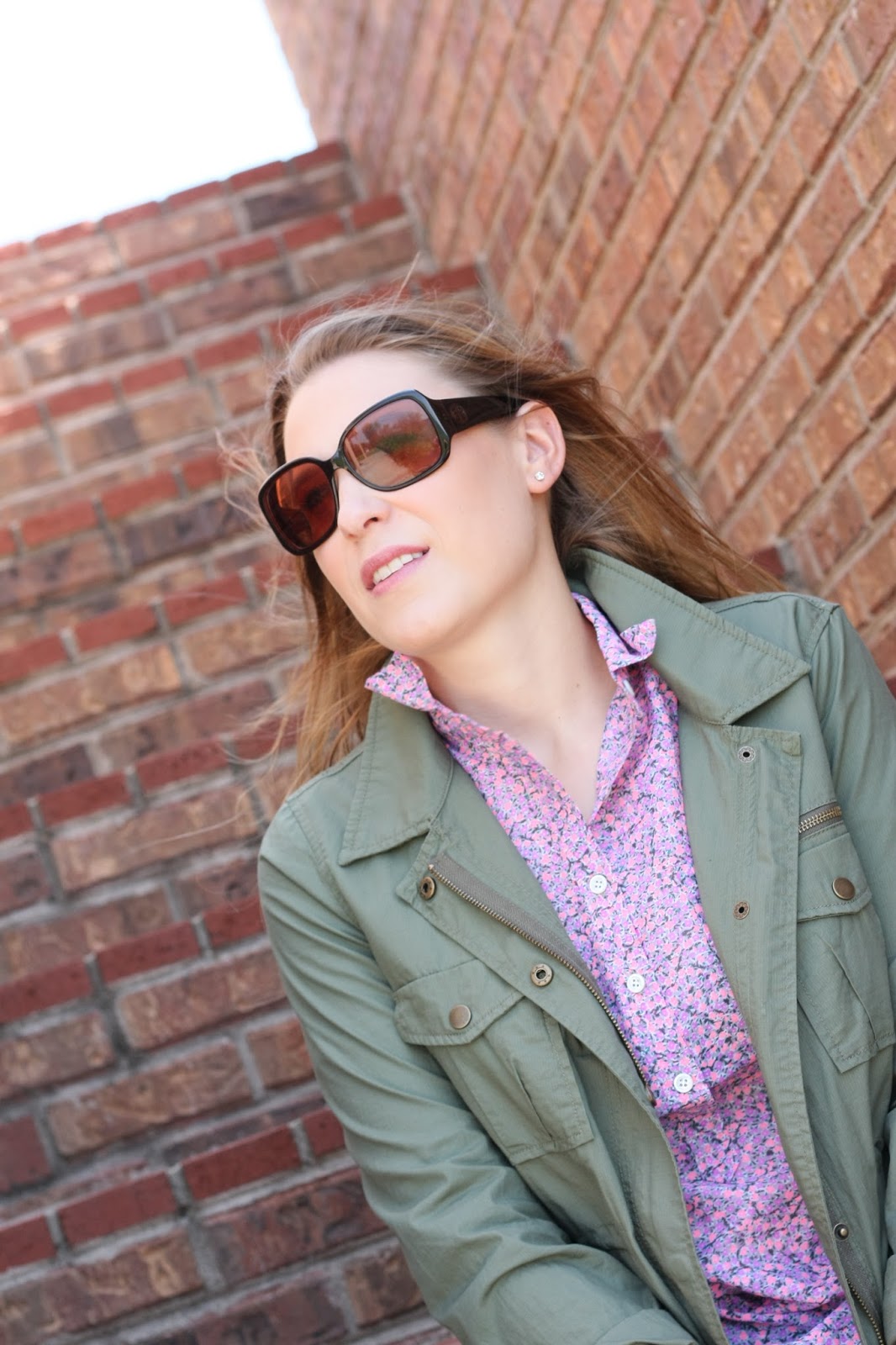 Utility Jackets are a great piece for fall. I love the ones with the cinched waist. This one that I’m wearing you can make tighter by using the strings on the inside. I love that because it give you more of a waist. The flower button up underneath is great with the jacket because it brings a more feminine side to a masculine style jacket.