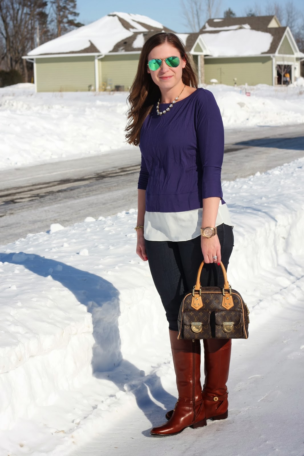 Shirt: DKNYC, Jeans: J Brand, Boots: Tory Burch (Similar on sale), Purse: Louis Vuitton (similar), Necklace: Stella & Dot, Bracelet: Stella & Dot, Watch: Michael Kors, Sunnies: Ray-Ban